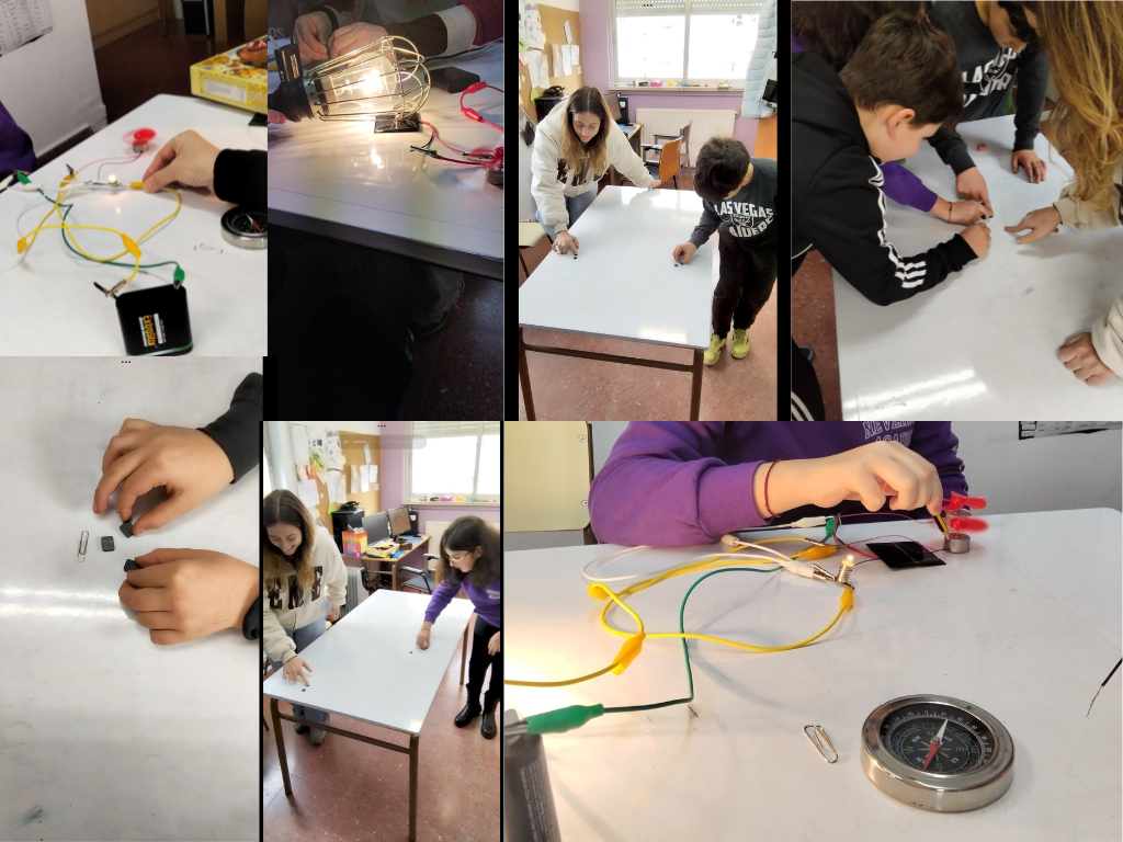 Para facer un circuíto eléctrico necesitamos unha fonte de enerxía neste caso, usamos unha pila, aínda que nós tamén probamos cunha placa solar e tamén funcionou. Conseguimos encender a bombilla e o ventilador e descubrimos que hai materiais conductores ( tesoiras, clip...) e aislantes. Tamén conseguimos mover a agulla do compás con varios imáns e xogamos a atraer e a repeler mediante carreiras e futbol de mesa, comprobando que un obxecto pode exercer unha forza sobre outro sen que se toquen.