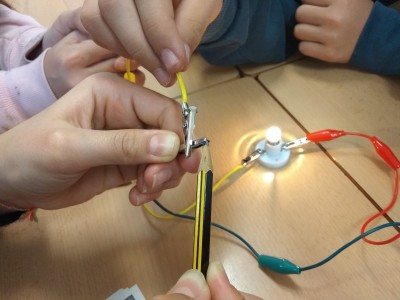 Para que circule la corriente eléctrica y se encienda la bombilla, necesitamos conectar dos pinzas de cocodrilo a cada uno de los polos (+ y -) de la pila. Después conectaremos el otro extremo de las pinzas de cocodrilo al portabombillas, si el circuito está conectado se encenderá. Un objeto puede ejercer una fuerza sin tocar a otro. Por ejemplo la aguja de la brújula se mueve cuando se siente atraída por la fuerza de un imán o de un circuito eléctrico. Cuando situamos cerca dos imanes se atraen entre ellos cuando los polos son opuestos y se repelen cuando los polos son iguales. La aguja de una brújula siempre señala el norte en la tierra porque es un imán bipolar que se siente atraido por el norte geográfico.