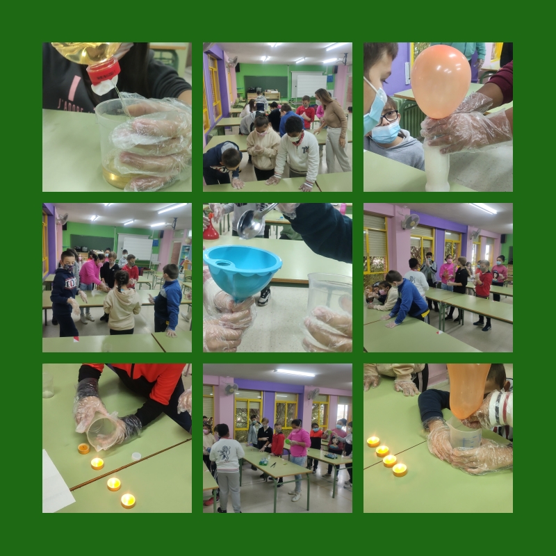 ¿Solo existe lo que vemos? No, existen muchas cosas que no podemos ver, como el aire, el oxígeno, el dióxido de carbono y el nitrógeno. De hecho, hemos descubierto que el gas existe aunque no lo vemos, porque ha apagado la vela. ¿En qué formas o estados podemos encontrar la materia? Podemos encontrar la materia en estado gaseoso, líquido y sólido. ¿Se puede producir un cambio de estado? Sí, se puede producir un cambio de estado por ejemplo cuando el agua pasa a estado sólido (solidificación); de estado líquido a gaseoso (vaporización) o de estado sólido a líquido (fusión). ¿Qué es la densidad? La densidad es una propiedad que explica la relación entre la masa y el volumen de un cuerpo. ¿Ha sido importante la densidad en estos experimentos? Sí, porque si el dióxido de carbono no hubiese sido más denso que el aire no habría caído para apagar la vela y desplazar el oxígeno.