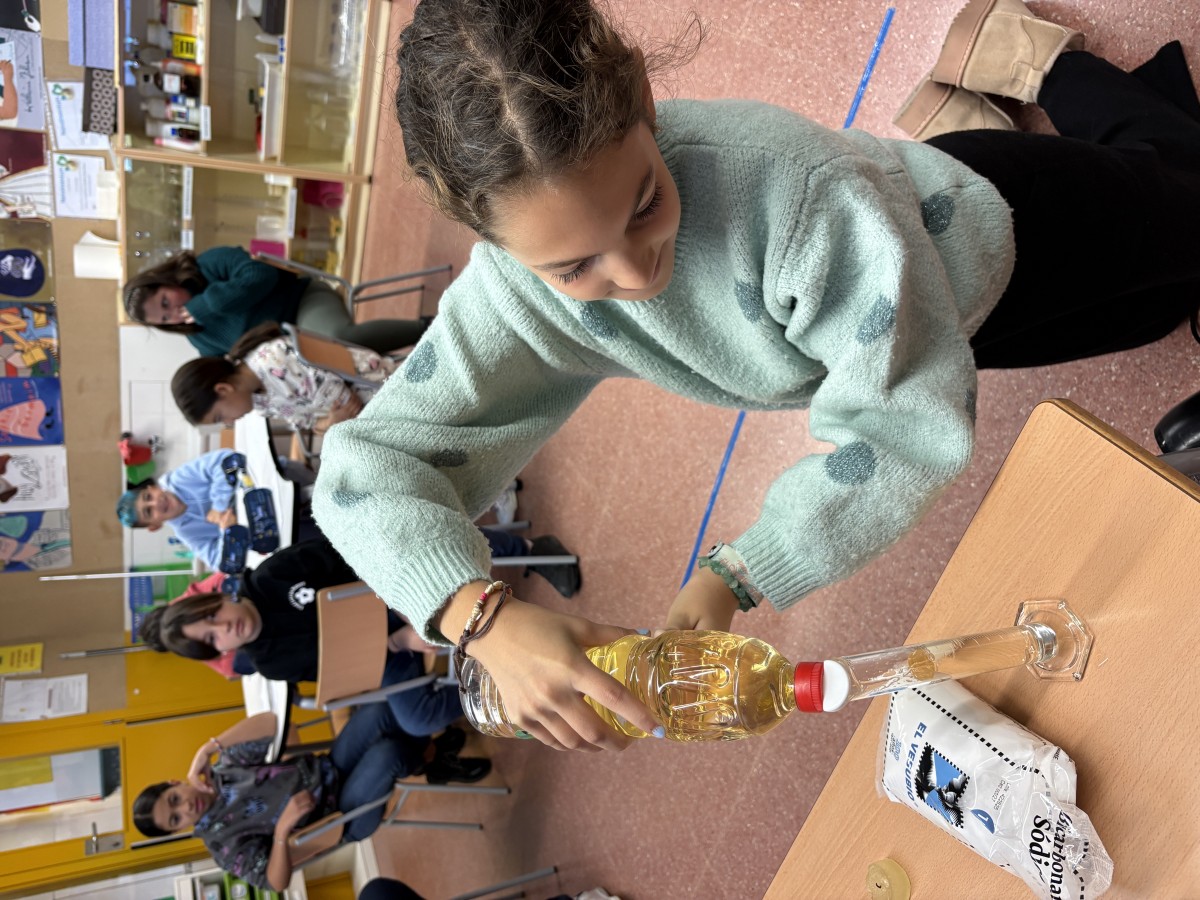 En aquest laboratori hem descobert que no només existeix el que veiem. Quan barregem vinagre i bicarbonat es forma un gas invisible que infla el globus i apaga les espelmes, així que tot i no veure’l, sabem que hi és. Hem treballat amb tres estats de la matèria: el bicarbonat és sòlid, el vinagre és líquid, el gas que s’ha format és gasós. No és només un canvi d’estat, sinó que es produeix una reacció química i apareix una substància nova: el gas. També hem après què és la densitat: és com estan de junts els materials en un mateix espai. El gas que es forma és més dens que l’aire, i per això baixa, s’acumula al fons del vas i apaga les espelmes. Gràcies a aquests experiments hem entès millor que la matèria pot ser sòlida, líquida o gasosa, que es poden produir reaccions químiques i que hi ha coses invisibles que també són reals.