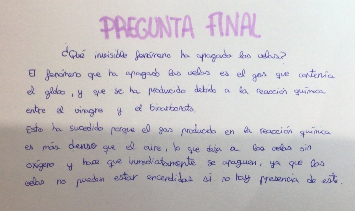Hemos comprobado que el gas generado, se puede oír y que huele. Además de que pesa puesto que al llenar un globo, solo soplando, comparado con el que se había hinchado en la botella, el peso era diferentes. También hemos experimentado que el gas tarda mucho en irse puesto que hemos dejado un globo, a ver cuánto tiempo el cuesta desincharse, y dos días después sigue algo hinchado. Hemos comprendido mucho mejor el concepto de densidad, además de entender que la vela (combustión) necesita de oxígeno para seguir la vela encendida. Que ha sido muy importante dejar salir el gas del globo poco a poco porque el año pasado, el otro grupo de 6ºrealizó también este experimento y no les salió. No hemos podido enviar fotos del grupo, solo de nuestra reflexión final porque a las profes se les olvidó, están tan emocionadas como nosotros y no se acordaron.